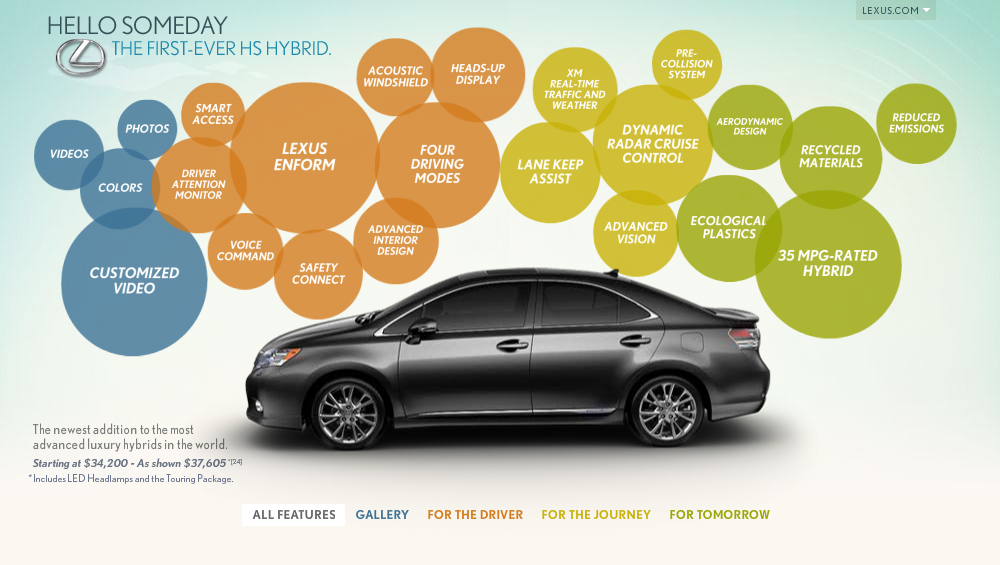 needed to produce a micro-site for the launch of the all new Lexus HS Hybrid. I built the Flash application and developed the motion design for the site.